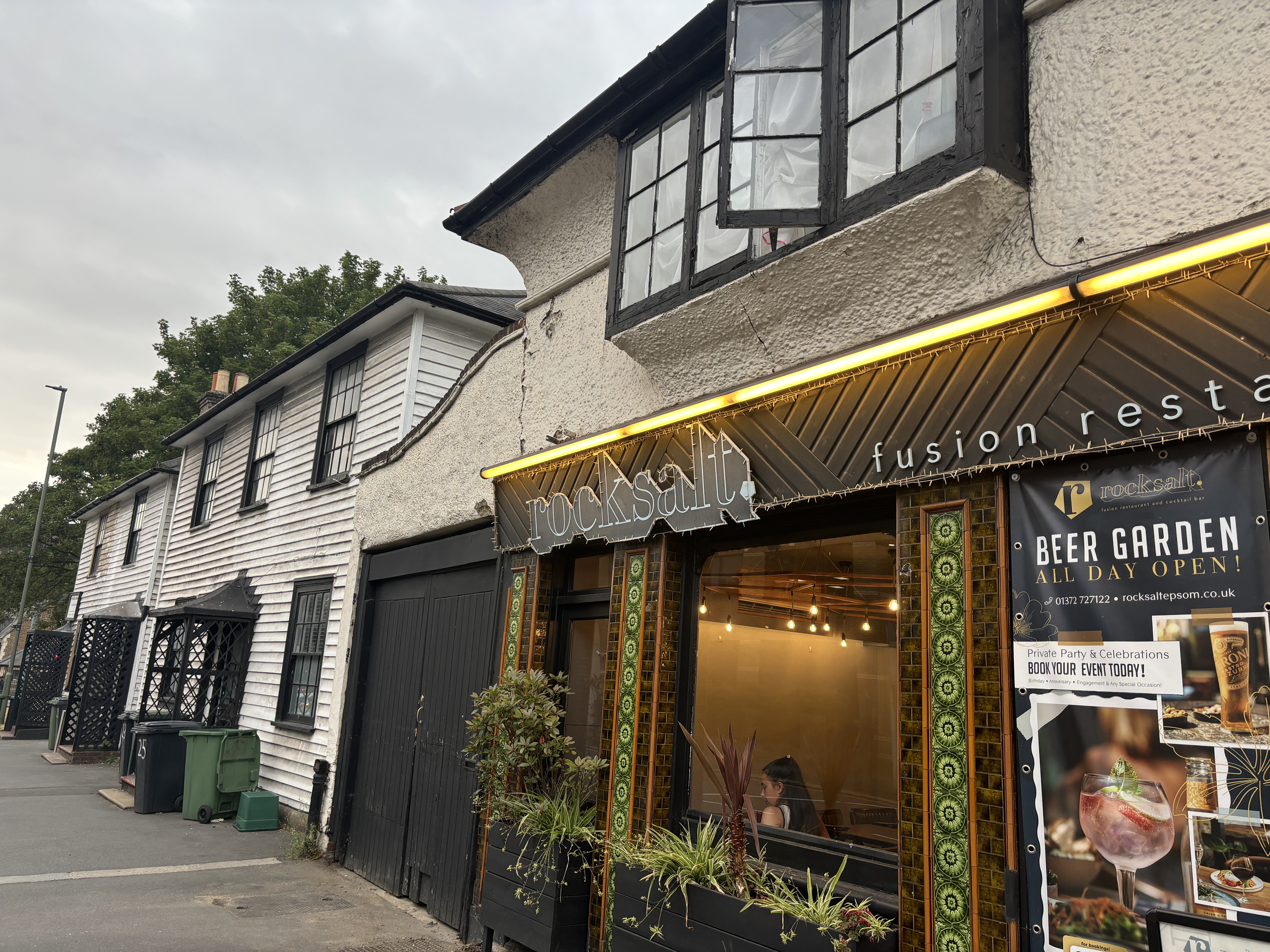 My favourite part of Rocksalt might actually be outside. The outdoor space has stone flooring, warm lighting, and wooden walls lined with tables — and somehow, it really does feel like dining abroad. It’s peaceful and ambient, and when the weather’s good, there’s nowhere else in Epsom I’d rather be.